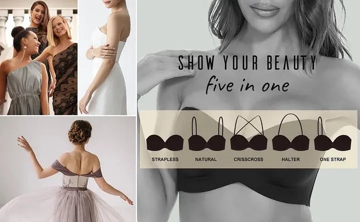 The detachable-Strap bra can convert into 5-ways: strapless, halter, cross back, single shoulder strap, and conventional. Ideal for strapless dresses, spaghetti strap tops, wedding and bridesmaid dresses, off-the-shoulder clothing, low-cut t-shirts, etc.